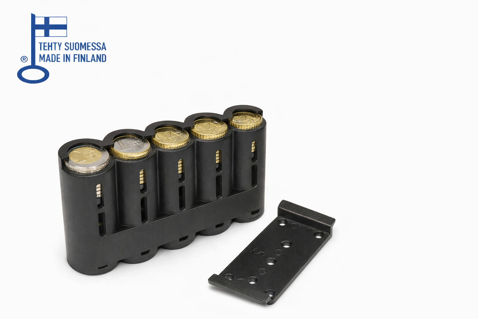 Raharenki kolikkopidike autoon telineellä. 5 kolikolle, tukeva kiinnitys. Tehty Suomessa!