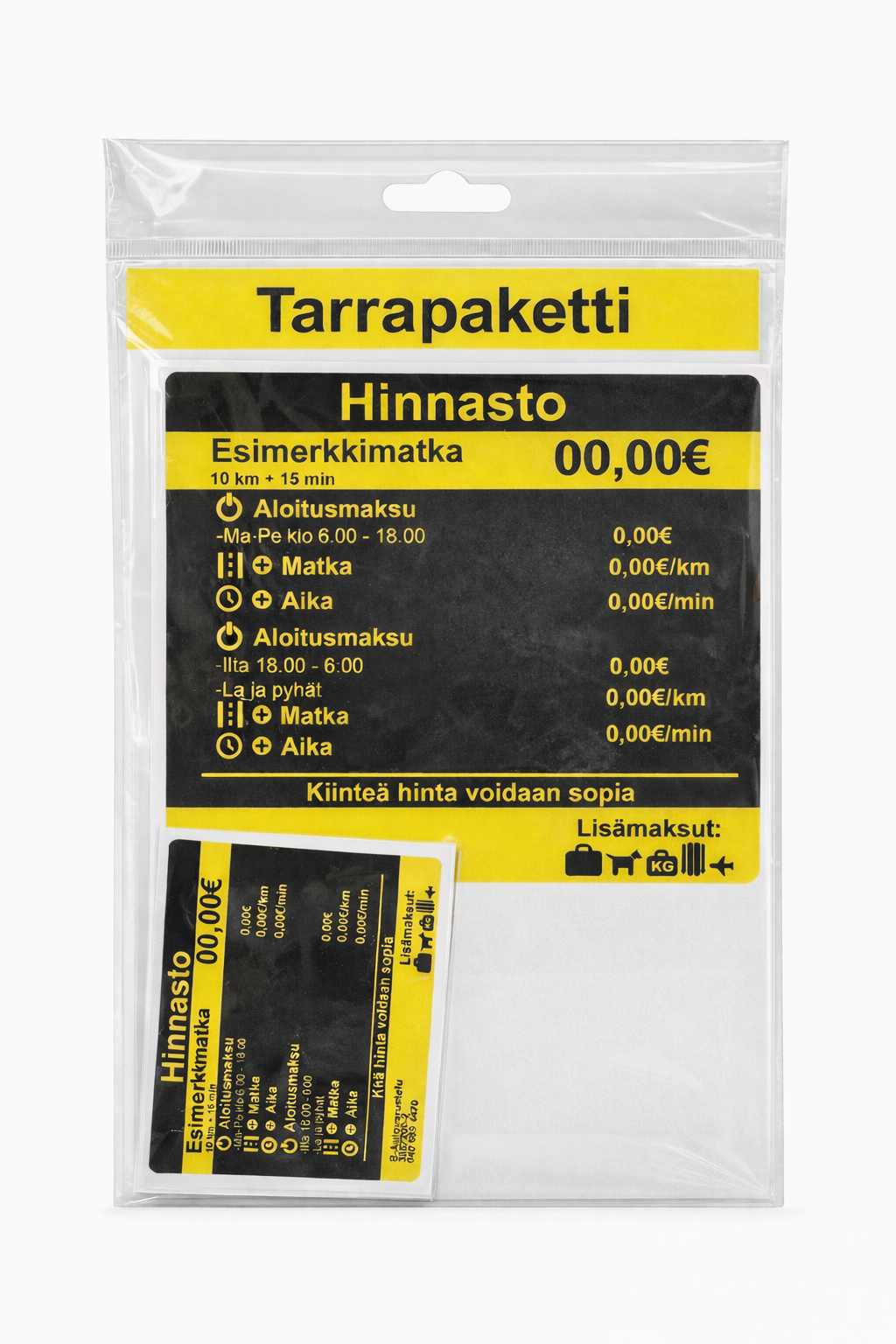 Hinnastotarrapaketti taksiin: iso tarra ulkokäyttöön ja pienempi sisätiloihin. Selkeä ja kestävä toteutus.